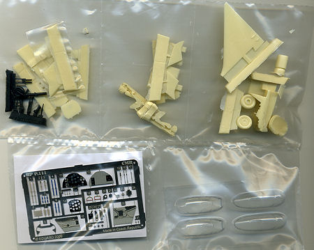 In addition to the superbly cast resin, the landing gear are in either black injected plastic or are reinforced with wire. There is also a color photo-etch fret produced by Eduard specifically for this kit. What's the shame is the much of this fret is for the interior and the way the canopy is on this plane, little will be seen of the cockpit.