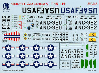 One can do seven different markings options, all of them in unpainted metal with OD anti-glare panels on the nose. The short tailed plane is from the NAA Flight test division with a red, white and blue spinner as its only non-standard marking. There are three ANG planes from the 139 FIS, NY ANG trimmed in blue, 194 FIS, California ANG trimmed in red and 181 FBS, Texas ANG, trimmed in green. There are decals for the Texas ANG trim with the other two requiring paint. The fifth option is for is a pre-USAF scheme with the 56th FG in 1946 with the pre-war rudder stripes. Another pre-USAF scheme is for the 57th FG in Alaska in 1957 with a yellow fin band. Finally, a 1403 Maintenance Squadron aircraft assigned to MATS at Andrews AFB in 1951. Decals are superbly done and printed by Tally Ho. As is often the case with European decals, I find the blue surround to the 'wings' of the insignia to be too thin. You'll notice that both the black and insignia blue USAF markings are provided.