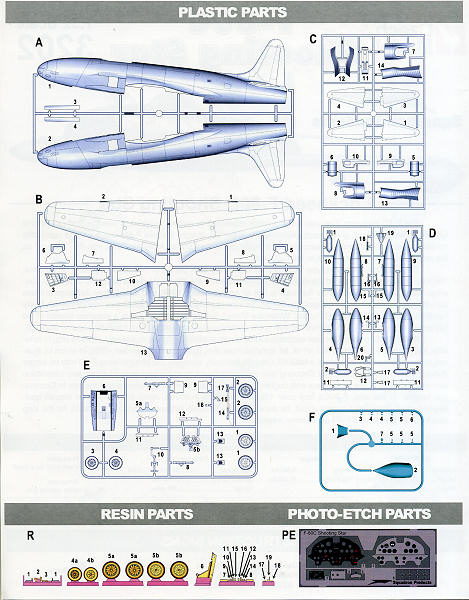 Instructions are superb. They are in color on quality glossy paper and have very well drawn 3D construction illustrations. Color information is supplied as there are detailed info drawings to be sure you get things in the proper place. Optional parts are also noted with the comment that one needs to check reference photos to see which options applied. This is mentioned in the wing tip light assembly and since two different styles of nose and main wheel are given, the builder will have to determine what goes where. Frankly, that information as to what applies to which markings option should be noted, especially if there are photos of the planes for the decals. The modeler will need to drill a hole for the pitot that goes under the nose.