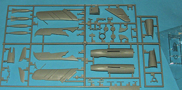 Molded on one grey sprue with a clear sprue providing the canopy, the kit is actually rather well done. Engraved panel lines and sufficient cockpit and wheel well detail to please most are trademarks of this kit. You will need nose weight and there isn't a lot of place to put it so one will need to be creative in this regard.