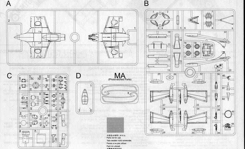Instructions are typical of Cyber-hobby and well drawn. Actual construction will show if any parts are mislabeled as sometimes happens. As is now the norm, color information is provided in both Gunze and Model Master paint lines. There are markings for two Extra Dark Sea Grey over White aircraft. As a note, the EDSG quickly fades to just Dark Sea Grey upon exposure to the elements. Markings options are for a shark-mouth aircraft from 894 Squadron aboard HMS Albion in the late 1950s. This is the box art plane with black and red checked tanks. It is also the markings on the original 1/32 Matchbox kit. The other is the required Suez striped plane from 892 Squadron in 1956 when operating aboard HMS Ark Royal. This one has tip tanks in white with a black stripe. The Suez stripes are provided as decals as are the black parts of the tip tank markings. Those with the old Modeldecal sheet will find other unit options, though I am pretty sure that Xtradecal will or does have a new sheet for this one.