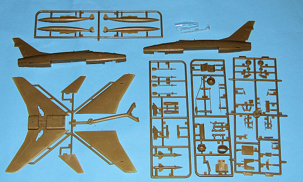 Molded in a tan plastic, the kit is very nicely molded with crisp engraved panel lines. There is no flash nor sink areas. However, ejector pin marks can be found on the inside of gear doors, on gear legs, missile bodies, pylons and a few other places. Some will be difficult to remove. The cockpit is relatively barren with but a control stick, seat and instrument panel. Instruments and side consoles are decals. A gun sight sits atop the instrument coaming.