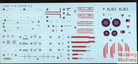 shows at least the upper color (the lower being invisible thanks to the angle of the sun). Lucky Lou, Saucy Sal, and Maid Marian are the three similarly painted planes offered. These are all from 55 Squadron. The fourth scheme is a 57 Squadron plane in the older Dark Green, Medium Sea Grey Grey over Light Aircraft Grey scheme. This scheme includes the wing stripes that are absent in the Hemp painted planes. The tail badge for this plane was rather infrequently seen on Victors in this scheme, the 57 in a white circle being much more common. The decal sheet is very nicely done and while the decals feel a bit thick, they should work very well.