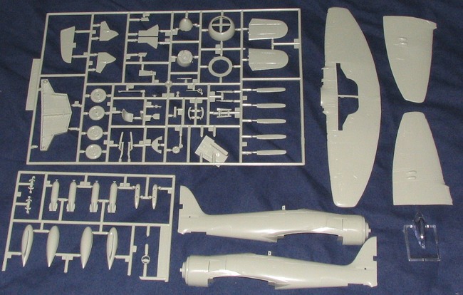So what comes with this kit? The first thing one notices is that the detailing is pretty good. Nicely engraved panel lines, a reasonable level of detail, and the usual ejector pin marks on gear doors and landing gear struts. The cockpit consists of a tub, seat, instrument panel, and stick. Decals for the instrument panel and consoles. Not real detailed, but adequate. The engine consists of merely an outer ring of cylinders. The close cowling and large spinner prevents any real detail from being seen anyway. Inserts are provided for the exhaust and provide 9 ports per side. I think this is a bit too many and on my kit I replaced them with tubing.