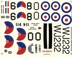 Instructions for this 1993 kit are pretty typical of Hobbycraft. No interior color information is provided at all in the six well-drawn construction steps. One does have to determine early if drop tanks or bombs are to be used as there are holes to be opened up for the drop tanks. Decals are for two aircraft. One is the box art plane of 'Hoagy' Carmichael, who shot down a MiG-15 with his 802 Sq aircraft. Korean War ID bands will need to be painted on this one. The second if for a Dutch Navy aircraft from 3 Sq in 1955. Both planes are in Extra Dark Sea Grey over Sky. Decals are well printed and should work quite well as most 'black box' Hobbycraft kits have exemplary decal sheets.