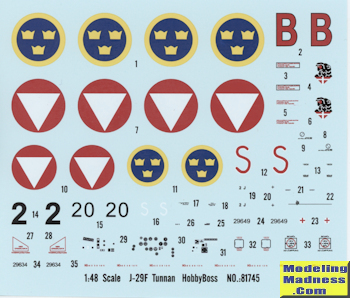 Markings are for two planes. One is the box art plane with the Austrian Air Force and the other is for 'red S' of the Swedish Air Force that has a red nose band and forward fin. Decals are nicely printed and should provide no issues. I'm not sure if a plane like this will engender any aftermarket sheets as the Tunnan was not camouflaged except for those sent to the Congo, but we'll see.