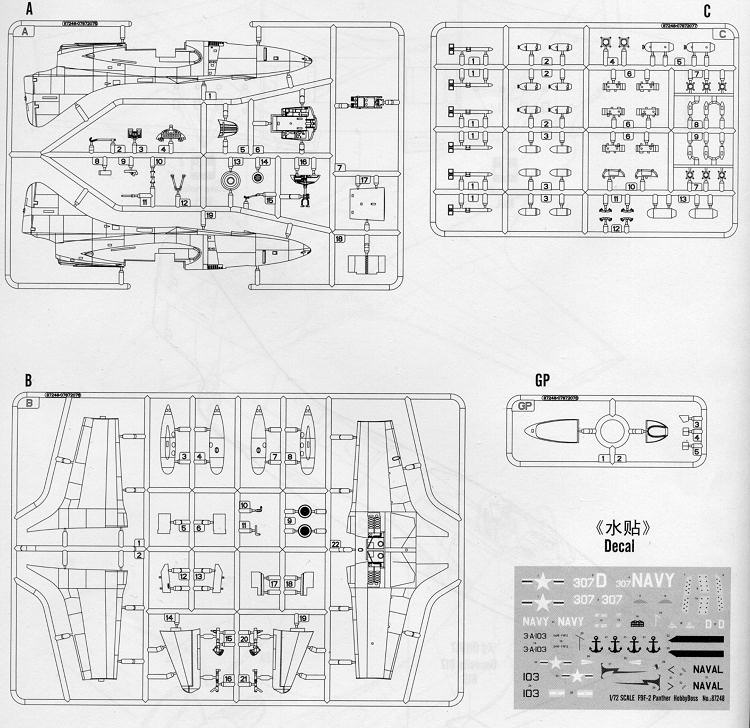The Panther is a pretty simple aircraft as these things go so build time should be minimal. One entire sprue is dedicated to weapons. The kit will require holes in the wings to be opened if you want to use them. There are six single stub 5 inch rocket pylons and one inner one for a 500 lb bomb. Now if you want all eight wing stations to have bombs, you can do so as there are additional bombs and racks to take care of that. I imagine the range would then be about 50 miles with that load! Wing tip tanks are separate items and there are no other wing tip options. Panthers rarely flew without these tanks. The one think the Hasegawa kit has on this one is a separate speed brake. This one is molded closed.