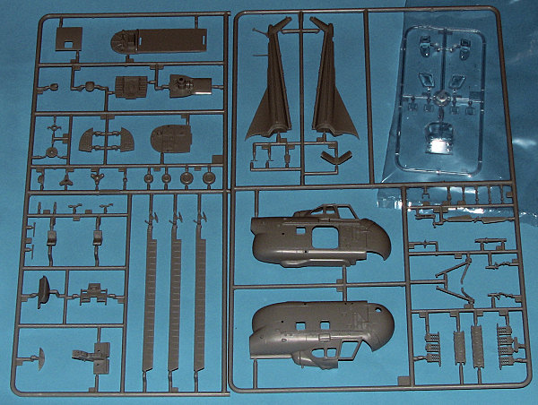 This is, I believe, the third or so boxing of this kit, not including those done by Revell. The kit comes on two grey and one clear sprue. Detail on the parts is quite good and though I did find ejector pin marks on several, they will be mostly invisible once the kit is built. The main exception are those on the cabin floor, though if you do the door closed, they too will be invisible.