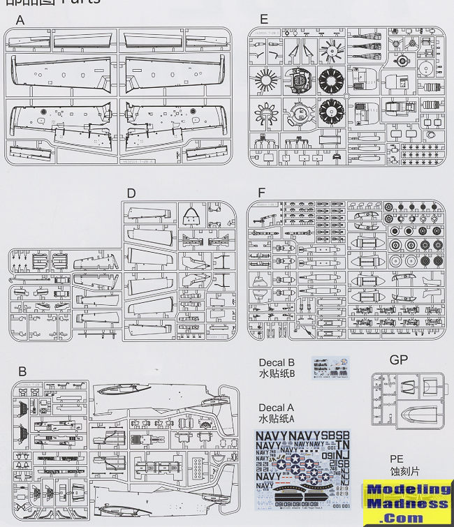 Instructions are very nicely done in Kitty Hawk's usual booklet style with large color foldouts for the color options. Color information is provided throughout the build process. You get several markings options, all of which are colorful, and here lies the rub. Some of these are warbirds as they include N registration numbers. Of course, you can simply not apply that decal and you should be good to go except in two cases. One is in a faux Jolly Rogers scheme and another has a TN tail code and girlie nose art. I'm also not sure about the all yellow one and the SB code on the fin. However, you can be sure that the aftermarket crowd will help to provide options. Besides, there are modelers who like to do warbirds and this kit provides that option for them. The decals are superbly done, very thin, and with minimal carrier. I should add a kudos to Kitty Hawk for not only providing a large decal sheet, but also for providing a zip bag for them. I wish all model companies did this.
