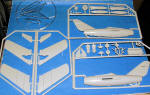 The cockpit tub has raised detailing on the side consoles with room for rudder pedals and control sticks. The seats are well done, but I'm not entirely sure of their accuracy, though they are convincing. Placement of the cockpit tub requires some guesswork as there is no clear mounting post or ledge. Wheel wells provide some detail and the somewhat softly molded landing gear are complex looking enough to please most. The inner wing fences both have notches cut so the pilot can view the gear down-lock indicators. Both the intake and exhaust are blanked off to prevent see-through and that leaves enough room for nose weight. The two drop tanks are fairly well done and there are mounting holes in the wings for these and the radio altimeter antennas. The one piece clear canopy is nicely molded, but a bit distorted. I have also found that these don't always fit perfectly so care needs to be taken. The kit does come with a nice display stand, also a remnant of the past!