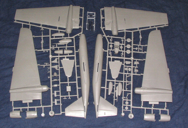 OK, I know you are waiting for a litany of things wrong. While I'm sure that there are shape issues that I don't know about (since I don't compare things with plans), I can tell you that things look very much like an RB-57. The plastic has a rather 'pebbly' surface texture and all the largish bits have ejector pin towers on one side. Sprue attachment points also intrude into the mating surfaces of many parts, so one will spend a bit of time cleaning things up. The tail planes are one piece castings with nicely done vortex generators on both sides. Since the parts are a bit thick, there are sink areas on both, some of which are under the vortex generators, making fixing this a challenge to say the least.