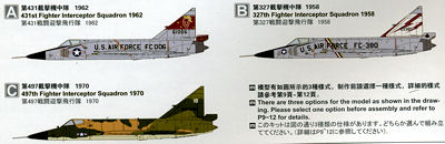 plane is from the 327th FIS in 1958 and has a great white tail with red lightning bolts on it. The third option, which gets the seeker head, is a camouflaged version from the 497th FIS in 1970. I am thinking that this unit flew in Vietnam, hence the camo scheme. The rather large decal sheet is very nicely done and quite in register. There have been aftermarket markings done for this aircraft so you may have some options in that regime if none of the kit markings strike your fancy.