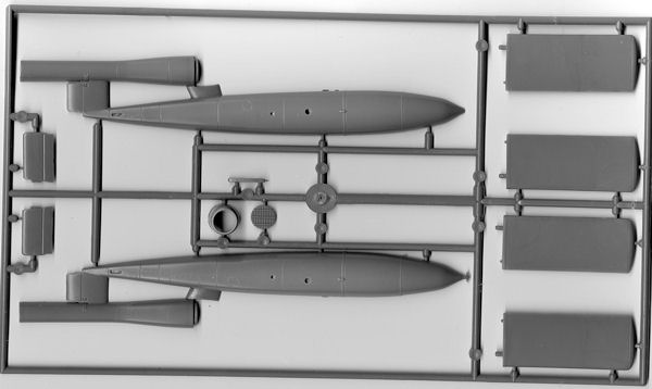 You just cannot get much more simple than this kit. Basically 11 parts. Two for the fuselage and engine halves, four for the wings, two horizontal stabs, two engine intake and a skid. I should also mention that as kitted, this 2003 offering it isn't really a Loon. The biggest area of difference is on the forward engine support. On the Loon, it had a vertical front facing and a long, sloping rear section. Look at the photo above and you'll see what I mean. The kit is more of a Fi-103 (V-1) than a Loon because of this feature. I'm also thinking that the forward part of the engine should be more of a straight cylinder and the kit has it as more conical, tapering back to about half way.