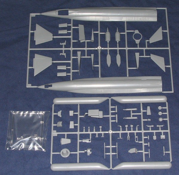 There are three sprues of plastic with finely engraved panel lines. One of these sprues is quite small and consists of the clear bit. Actually, the entire canopy section is clear, so all one has to do is mask off the window. Parts not used are for the scram-jet as the kit includes the additional fuel tanks used in later flights.