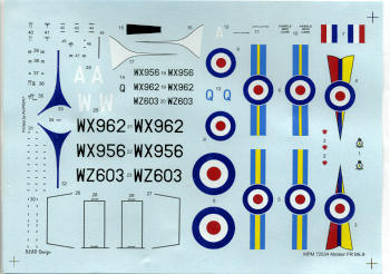 The instructions are well drawn with smaller detail drawings where needed. Paints are by generic and Gunze references. If any bits are required for a specific markings option, that is so noted. Three markings options are provided. The box art plane is from 208 squadron and while it is shown in what looks like bare metal, I'll bet it is actually high speed silver. There is another 208 squadron plane in camouflage paint with large patches of orange on the tip of the engine nacelles, forward and center fuselage for Operation Musketeer in 1956. The third option is a camouflaged plane with 8 squadron. The decals are very nicely printed and should work well. Some parts of the various options will have to be painted to match the stripes given.