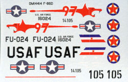 Instructions are basically an exploded view, which is fine for a kit like this. The decals are probably still ALPS printed as they seem to be on a single carrier. You may wish to coat them with a clear to help keep them from damage. Markings are for two aircraft: one is the box art plane from the 97 FIS. I believe these are special markings as normally, the '97' was not present. The other is a Yugoslav F-86D. This aircraft has a large, dark purple nose and a sharkmouth. The builder will need to paint the purple. I should also mention that when these planes were camouflaged, the aircraft number was also on the wings opposite the ones with the insignia. I am not sure if this was also true of the bare metal ones.