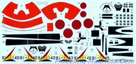 The decal sheet is large and colorful, providing markings for whichever aircraft you are modeling. The da-glo red markings are decals as are all the black painted areas of the lower nacelles, wing walks, and the de-icer boots on the flying surfaces. You only have to paint the nose white for one of the versions that does not have a nose radome. Both Gunze and Model Master paint numbers are provided.