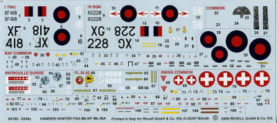 Markings are provided for four aircraft. All of them are in Dark Green/Dark Sea Grey (I believe) with the Swiss planes having an Aluminum underside and the RAF ones listed as White. I'm not sure about that last as I think it is probably supposed to be a light grey. I'm certainly not painting my RAF Hunter with a white underside. First option is for a 1 TWU plane from 1979, painted with Red outer wing panels, tailplanes and large drop tanks. The second RAF bird is a 79 Squadron one, also with 1 TWU in 1984. There are two Swiss Mk.58s. One is a Patrouille Swiss plane from 1991 and the second is a Fliegerstaffel 20 aircraft from 1993. Other reviewers have complained that they are a bit transparent, but that can be overcome by using aftermarket decals if one is concerned. They look fine to me.