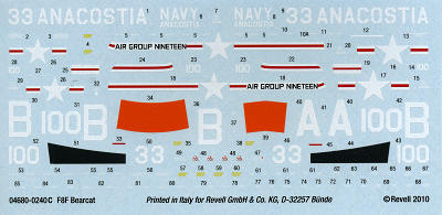 The decal sheet for this one is first rate and includes markings for the box top plane, the CAG bird from CAG-19 in 1947 and a USN Reserve plane flying out of Anacostia in 1952. The decals are superbly printed by an Italian company. Instructions are well done though it follows the irritating trend of using only company produced paints, requiring the exterior color and interior color to be mixed. The outside and wheel wells and gear and wheels are USN Gloss Sea Blue. The interior is probably a chromate green as they have you mixing Bronze Green with Yellow. I'd use US Interior Green myself.