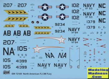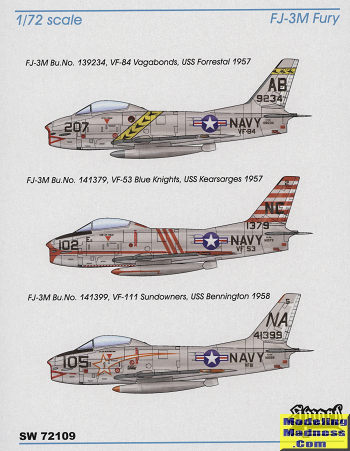 As in the earlier preview, the instructions are well done with generic color information and color views of the painted items during the build. Markings are provided for three light gull grey over white planes. Again, the leading edges of the flight surfaces are listed as medium grey but they really are coated aluminum. The intake warning areas on all three options will need to be painted by the builder. First option is with VF-84 Vagabonds aboard the USS Forrestal in 1957. Second is with VF-53 aboard the USS Kearsarge in 1957. ALL of the red bits on this will have to be painted and for that reason, few will actully do this scheme. Finally, a VF-111 Sundowners plane aboard the USS Bennington in 1958. The Techmod decals are quite nicely done and will prove to be quite thin.