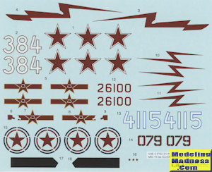 Instructions are well done in both cases and provide the usual Tamiya-only paint references. There are two sets of decals with this boxing. The one with this boxing's name on it has a slightly darker red than the standard sheet. In both cases the markings are identical with three natural metal planes, one with Soviet, one Chinese with an all red tail section, and the other with North Korean markings. Another Chinese plane in overall green with darker green squiggles is the third option.