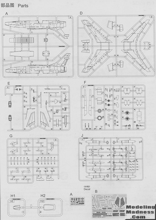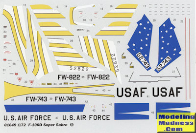 Instructions are typical Trumpeter and should cause no issues. There are two very colorful markings options, neither of which are identified on the placement guide, only on the side of the box, also typical of Trumpeter. The box art plane is from the 493 TFS/48 TFW based in France during 1959. The other is from the 338 FBW, though no other info is provided. Those with good eyes will notice that the wing "USAF" is only included with the wing stripes for one of the options. If doing the box art plane, you'll have to cut these free or use aftermarket decals. I have not shown the smaller decals that include instrument panels and insignia.