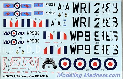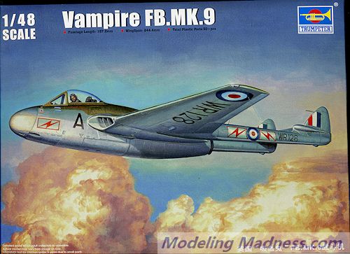 FB.9: tropicalised fighter-bomber through addition of air conditioning to Mark 5. Powered by Goblin 3 turbojet; 326 built, mostly by de Havilland, but also by Fairey Aviation.