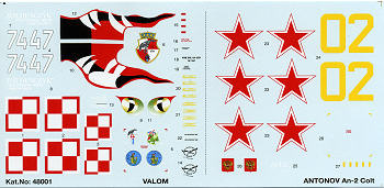 Instructions are the typical Valom book with a variety of paint references. The construction steps are well drawn with a number of additional insert drawings to help through some of the more complex build processes. Markings in this kit are for two military planes. One is the rather flamboyant special scheme from the Polish Air Force. If one wants to do a standard PAF plane, just leave off the special bits. The other is a standard Soviet Air Force version in dark green. The decals are very nicely done and look to be nice and thin.