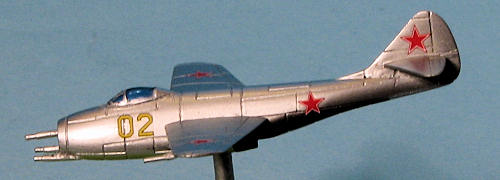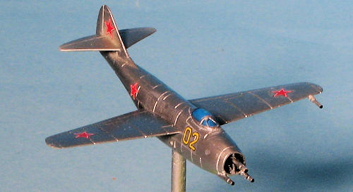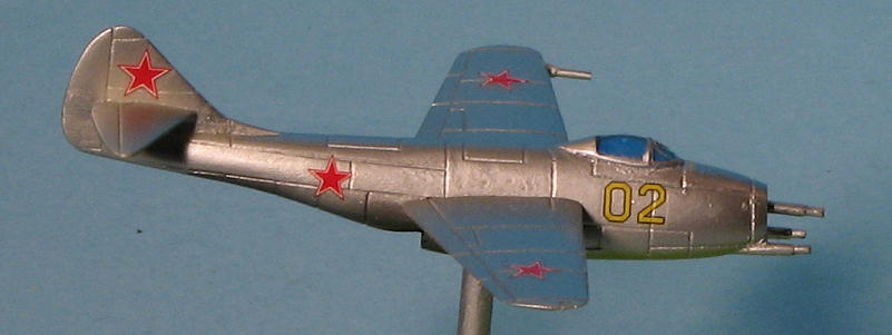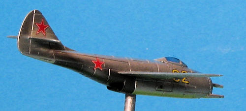 Decals were applied. Now this was a bit of a poser as the instructions showed only fin and lower wing insignia, yet gave me six of them. Looking at photos on the 'net, I saw that MiG-9s were adorned with four, six or eight red stars. I picked 8 and applied the markings using spares on the decal sheet. Bort number was then stuck on. Mr. Decal Mush was applied to soften the decals and these actually cooperated by snuggling into engravings.