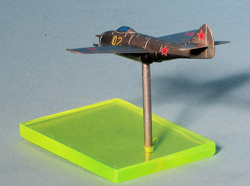 Then I started looking around for something to use for a stand. Most of what I had was really too large for a model this small. I ended up using a small rectangle of clear bright green plastic with a 1/8" hole drilled in it for a wood dowel. This size hole was also drilled in the bottom of the MiG. Then the dowel was stuck in place in the model and painted silver. Next, it was stuffed in the hole in the base. It is a tight fit so no glue was harmed in this step.
