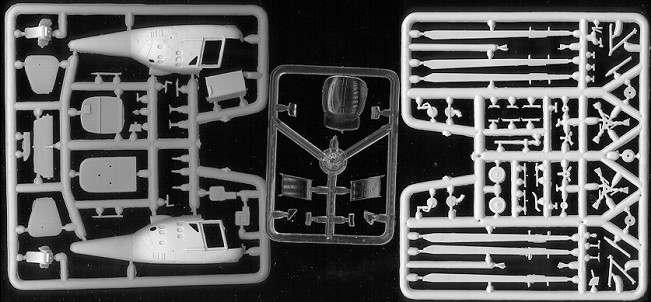 Instructions are fine of the kit with five well drawn construction sequences. Color information is provided with generic and Humbrol references. Much of it is shades of grey. That extends to the exterior of the helo as well with all three in an overall 'Slate Grey', differentiated only by fuselage number (or lack of it). There is an excellent color photo on the box top that will help a great deal when building and painting this kit. Decals are what one normally expects from a Russian kit company in that they are quite matte and have a somewhat large carrier film. My experiences with these kinds of decals are mixed as more often than not, they give me some trouble. This is either by breaking up, or not doing well with setting solutions and silvering. However, not having built an A-Model kit, I'll reserve judgment until I actually get around to using them.