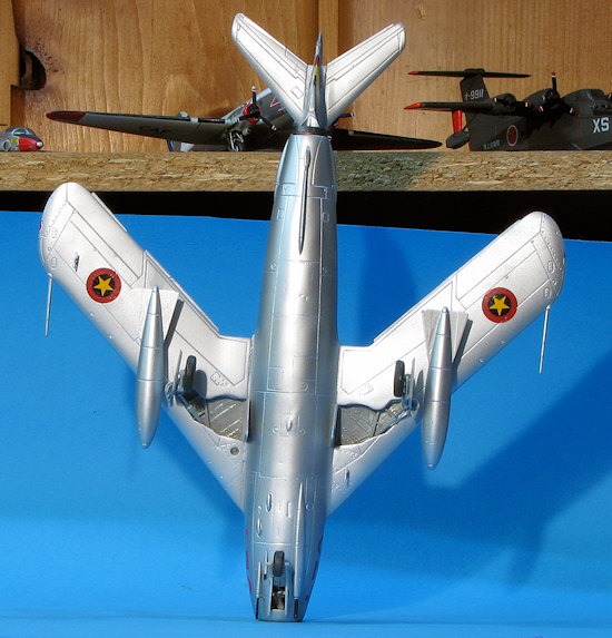 On the underside are various cannon bits, antennas, lights and the short ventral fin. Canopy and windscreen are separate with well defined frames. For ordnance you have your choice of bombs or rocket pods or even wing mounted rockets that are in pairs. When mounting either the pylons for the bombs or the rocket rails, one has to look for little dimples in the lower wing to determine where they go. Note that most MiG-17s were not always equipped with these things, though the Polish Lim was, and so were most Egyptian planes once the MiG-21 took over their interceptor duties. The bomb pylons for these were locally manufactured and quite different from those installed by LIM.