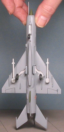 nowhere near the bend. Same trouble with one of the nose gear doors. It snapped quite easily. These were repaired and then glued in place, followed by the inner gear doors and the main wheels. I then cut off the wing rad alt antennas; unfortunately, after one was glued in place, the other disappeared into the distance, never to be seen again. Why does this always happen to the second one? The last thing to add on were the missiles. These AA-2s came from a Dragon 1/72 Soviet Weapons set that includes a bunch of other neat missiles and is perfect for when you get a kit that has garbage missiles.