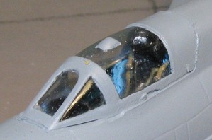 I painted up the seat as was shown in the instructions, with a light blue frame and black seat interior and head set. I deviated a bit and painted the belts in a dark tan color. This was then glued into the cockpit. I attached the pitot and smaller probe to the nose and then the canopy that I masked prior to gluing. I had to trim the front of this a bit for a better fit as it was also a bit long in addition to being too narrow. A chunk broke out of the canopy when I was removing it from the sprue. A fault of the brittle plastic.