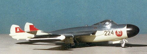 The rather dumpy looking Sea Venom was the R.N.'s first allweather jet fighter and replaced the lovely Sea Hornet in the mid 1950s. As weremany early naval jets, it was an adaptation of the RAF Venom, in this case theNF.2 night fighter. Like most navalized aircraft, this one was principallydifferent from its land based brethren in having an arresting hook, foldingwings and a stronger structure for carrier landings.