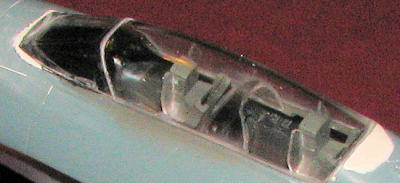 ed in place. Then the canopy section was installed. Well, it did not fit as it was too long. In this case, I did most of the plastic removal on the back area of the fuselage where the canopy fit, though a bit was also removed from the front and rear of the canopy itself. Once that was done, the resin seats were painted and removed from the resin pour stubs. These are the best detailed parts of the kit, though lacking in any sort of harness, which would have been a nice addition to what is an expensive kit. These have little clear 'ears' that attach to the side of the seat. Super glue was used and the inevitable frosting scraped away once dry. They are a tad oversize so needed some trimming to get the canopy to close over them. They were then glued into the cockpit.