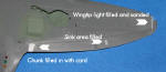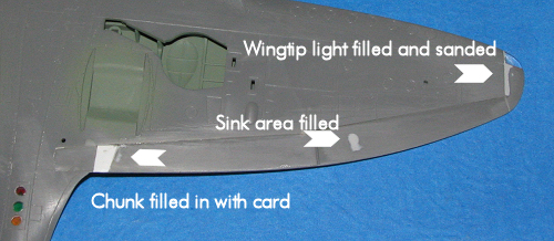 sink area in the underside that needed to be filled. Easily done. I also discovered that the wing tip area needed some filler. I painted the inside of the clear lenses for the wing tips and glued those in place. After the filler dried, I sanded things smooth as these lenses were a bit thick. Polishing returned the clarity. At this time, I glued in the ID lights after painting them the required colors.
