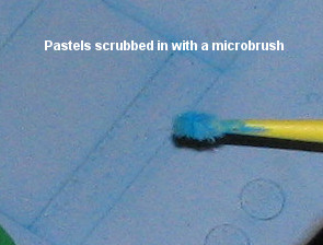glued them in place. There were only a few bits left and before that I wanted to do a pastel job on it. For the upper surface, I used a yellow microbrush and orange pastels. I usually choose a shade close to the main color for this and orange seemed to work well. It was scrubbed into the engraved detail then rubbed off with a finger or cloth. On the underside, I used a bit of a darker blue shade and did the same thing. It is interesting, but not something I do all the time. A bit of exhaust pastels were applied as well. I then glued on the pitot and radio mast on the underside of the wing and glued the prop in place.