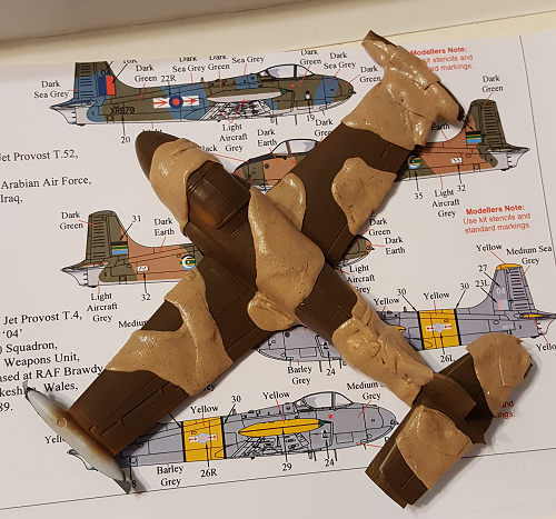 I started as I usually do, with the underside, for which I used Testors ADC Grey (now marketed as light aircraft grey). I then masked that when dry and painted the upper surface in some already mixed dark earth. When that was dry, I masked it using Silly Putty and sprayed on some dark green. Removing the putty, I saw that the dark earth was far too dark. I then used some Xtracolor dark earth, which was closer to what the instructions showed and hand sprayed that on, being too lazy to repeat the application of the Silly Putty. The nose was masked and the black area painted on using X-18 from the Tamiya range. It was then gloss coated with what currently passes for Future.