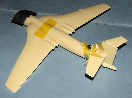 With the fuselage in pretty good shape, I then cemented in the fin, hoping to keep it properly aligned. The step in the fuselage and one in the fin meant a large gap on one side with the other fairing rather well. Several applications of super glue were used to take care of much of the gap. During this, the wings were glued into place, making sure they fit well on the top, where most would see t
