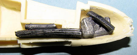 Next step was to tape the fuselage halves, wings and tail bits together to determine how much weight will be needed. This is done by placing one's fingers where the landing gear legs would go and placing weight on the nose. One then removes or adds weight as one sees fit. It ended up that I had to use about 3/4 of the lead sheet you see in the photo. This was folded, squished