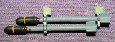 While doing the decals, I worked on the rockets. These are a PITA to clean up, but a sanding brace like that sold by Flexi-file does a great job of things. Airfix offers two painting options, each with different colored heads and bodies. One is OD with a Light Ghost Grey body while the other is Bright Red with an Aluminum body. Now I have to admit that a bright red warhead isn't something I've seen too often (I thought they'd be overall Bronze Green), so I went with the less brilliant shade. After decals and detail painting, they look pretty nice.