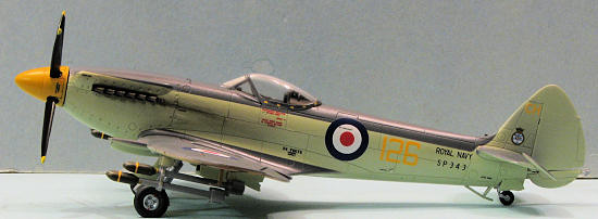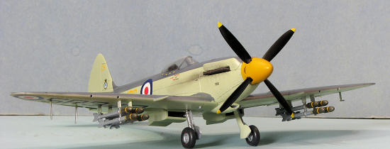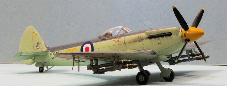 I've always liked the EDSG/Sky schemes where the upper demarcation line is high up. The one scheme that fit this was the 1852 Sq RNVR aircraft. Nothing really fancy in the way of markings with but a yellow spinner to add some color. I used Humbrol #90 for the Sky and a bottle of old Aeromaster Extra Dark Sea Grey acrylic for the upper color. The Aeromaster paint has been pre-lightened so really looks more like Dark Sea Grey, which is fine as the EDSG faded very quickly once it was painted on. I also painted gear doors and gear legs and the spinner while I was at it. There was a lot of masking done for the paint scheme and while it looks very good, it seems that I didn't do the upper EDSG high enough or the wing/fuselage demarcation line low enough. Nothing major but that one or two millimeter difference is obvious when you compare it with the markings placement guide. When done, the airframe was given a coat of Future to provide a glossy base for the decals.