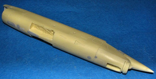 Next, I glued the fuselage halves together, making sure the panel lines matched up. Well, I could either have the nose lines match or the rest of the fuselage so I took the second option. I also glued on the rocket exhaust section to the back and the main intake section to the underside of the nose. There were some rather long chunks where the main fuselage sprues were removed by the factory and I used some epoxy putty to fill those in as it would have taken three or four applications of standard filler or super glue to get it all filled in.