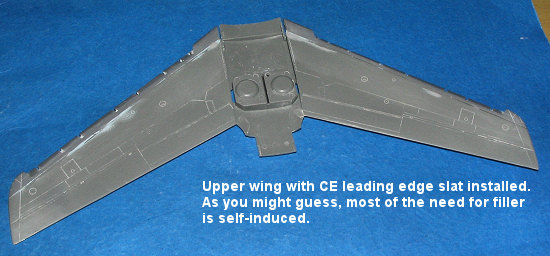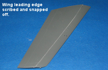 First thing I did was to read the instructions on how to modify the kit wings to accept the slats. It seemed pretty easy. Simply scribe like crazy on a panel line and remove the extension. OK, that I did. In fact, it was really easy to do as once scribed a half dozen times, it was a simple matter to simply snap off the leading edge. Things were going well, so I was starting to get nervous.