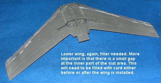 I then sanded the break area and glued the wing upper and lower halves together. When dry, I attached the leading edge parts by cementing them to the upper wing first. Then I attached the lower section. When putting on the slat conversion to the Hasegawa wing, I lined it up with the outer wing tip. This left what was a bit of a gap on the inside You can see this in the images. It seems that by sanding the fuselage first, I may have removed the additional space. This will have to be filled with card later. As I can never get a good fit on these