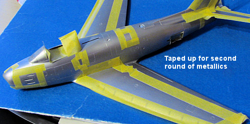 For this one, it is aluminum as the base, as is the norm for Korean War Sabres. I used Alclad II for all the metallics on this one. Then I masked off panels and used some dark aluminum and stainless steel and airframe aluminum and steel for some of the panels. I should point out that the wing pylons and slats were not attached for this. The former because of decals and the latter to keep from breaking them.