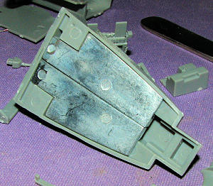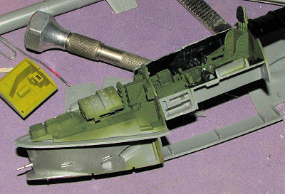 ainted. I used FS 34102 Medium Green for the cockpit interior and it seemed properly dark. The sidewalls and console tops were painted black as was the rear section that fits under the canopy. The gunsight area was built up and, minus the reflector, was painted black. It was later picked out in silver and dry brushed before the windscreen was attached, but that was much later.