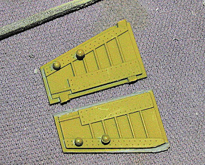Initial painting consisted of the inside of the tail pipe with Alclad II and the gear wells and gear door insides with chromate yellow using the small Testors bottle paint. I also cut the attachment tabs on the flaps so I could glue them in the up position and still have some remnants of an alignment tab. Probably could have removed them entirely if I wished. Just to show that one can get ahead of one's self. I carefully glued the wings closed then realized I'd forgotten to glue in the wheel wells! Fortunately, Tamiya glue is not quick setting and I was able to open them up again without any issues.