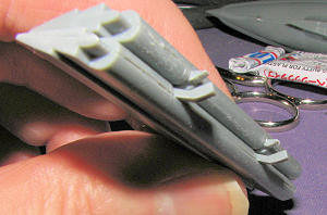 When I went to install the anti-sway braces on the pylons, I discovered that they were molded for the largest in diameter bombs on the sprue. Anything smaller had the little hold downs grossly far from the weapon. As I was using smaller diameter Tiny Tim rockets, it just looked silly so to get them a bit closer, I installed these upside down, trimming off the little flat discs. I had to open up the wing mounting holes a tad to get the pylon pins to fit flush.